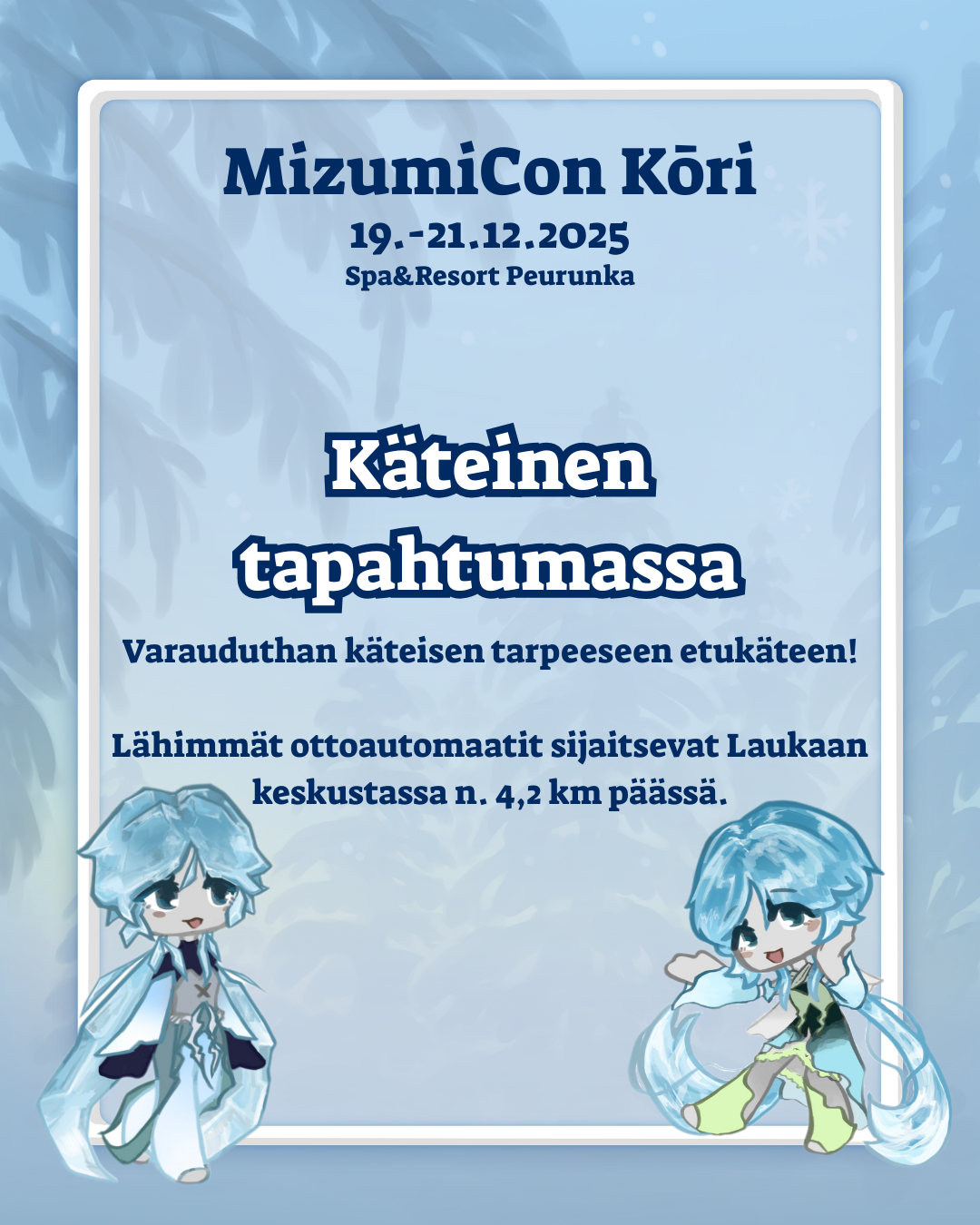 Varauduthan käteisen tarpeeseen etukäteen, sillä Peurungassa ei ole ottoautomaattia. Käteistä voit tarvita esimerkiksi taidekujalla tai pajaohjelmassa.
